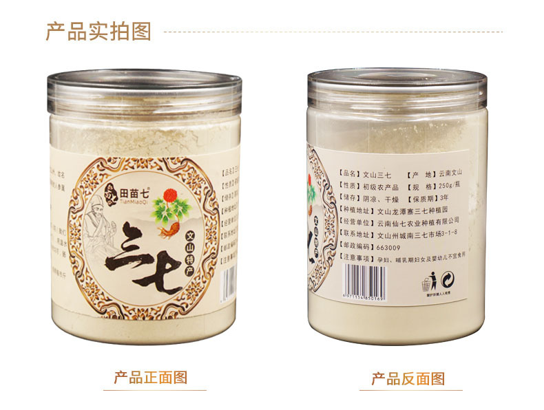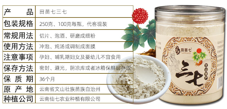 本网页所展示的有关【三七粉云南文山三七粉正品20头30头三七18头三七代磨粉25 0克瓶装1瓶_云南_云南仙七农业种植有限公司】的信息/图片/参数等由走进大理网的会员【云南仙七农业种植有限公司】提供,由走进大理网会员【云南仙七农业种植有限公司】自行对信息/图片/参数等的真实性、准确性和合法性负责,本平台(本网站)仅提供展示服务,请谨慎交易,因交易而产生的法律关系及法律纠纷由您自行协商解决,本平台(本网站)对此不承担任何责任。您在本网页可以浏览【三七粉云南文山三七粉正品20头30头三七18头三七代磨粉25 0克瓶装1瓶_云南_云南仙七农业种植有限公司】有关的信息/图片/价格等及提供【三七粉云南文山三七粉正品20头30头三七18头三七代磨粉25 0克瓶装1瓶_云南_云南仙七农业种植有限公司】的商家公司简介、联系方式等信息。