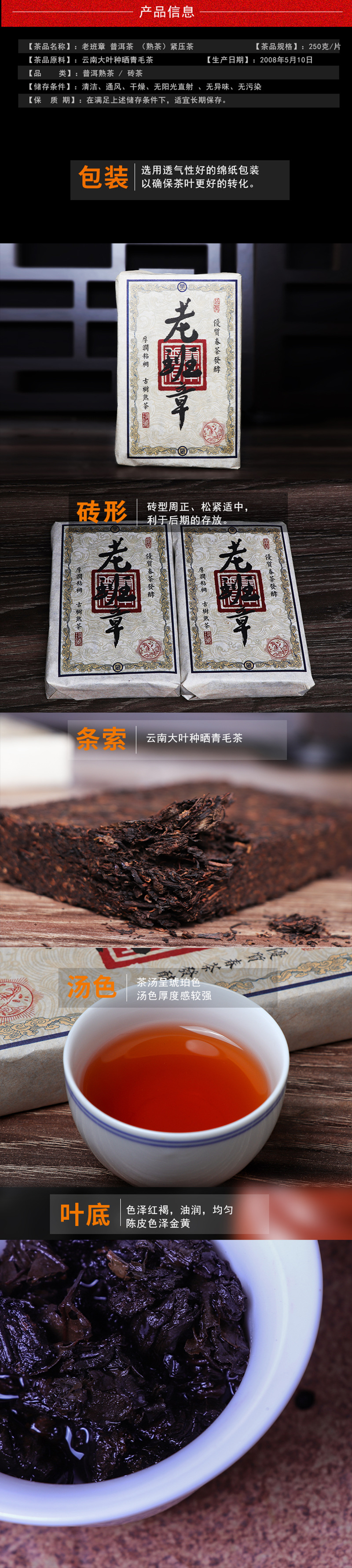 本网页所展示的有关【普洱茶老班章砖茶熟茶批发08年云南古树宫廷纯料人工发酵茶 砖250g1块_云南_云南茗悟茶业有限公司】的信息/图片/参数等由走进大理网的会员【云南茗悟茶业有限公司】提供,由走进大理网会员【云南茗悟茶业有限公司】自行对信息/图片/参数等的真实性、准确性和合法性负责,本平台(本网站)仅提供展示服务,请谨慎交易,因交易而产生的法律关系及法律纠纷由您自行协商解决,本平台(本网站)对此不承担任何责任。您在本网页可以浏览【普洱茶老班章砖茶熟茶批发08年云南古树宫廷纯料人工发酵茶 砖250g1块_云南_云南茗悟茶业有限公司】有关的信息/图片/价格等及提供【普洱茶老班章砖茶熟茶批发08年云南古树宫廷纯料人工发酵茶 砖250g1块_云南_云南茗悟茶业有限公司】的商家公司简介、联系方式等信息。