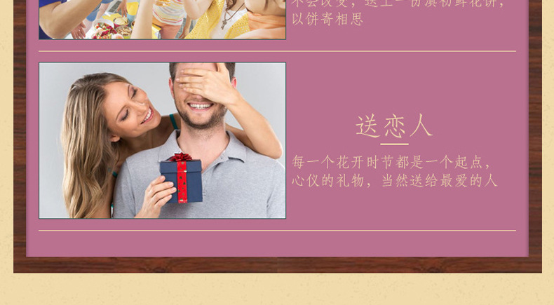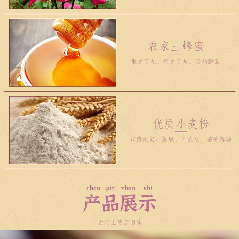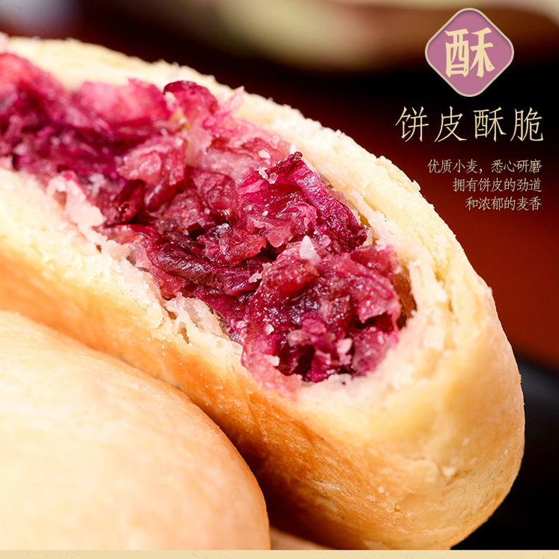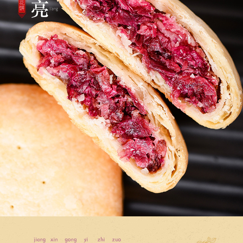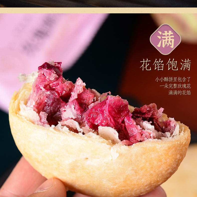 2、鲜花饼300g(10枚*30g)盒装(尺寸约18.2cm*6.2cm*14.6cm*)(也有大礼盒装960g32枚装)(鲜花饼散装)可批发,详询客服。4种口味:玫瑰原味、抹茶口味、紫薯口味、奶香口味,4种口味可混批。一口花香弥漫了唇齿,混着蜂蜜的深红花瓣,撩拨唇齿,饼皮香酥,一口花香一口酥。可以配手提袋(尺寸:36.5cm*12.5cm*29.5cm),送礼更适合。厂家直供,支持一件代发!可定制贴牌、OEM代加工、散装批发采购,量大价优。