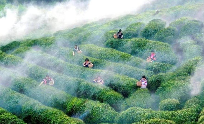 都匀毛尖,产自贵州省都匀市,主要产区为螺蛳壳山、以及团山、哨脚、大槽一带,贵州海拔可都是非常高的,产区海拔都在千米之上,云雾缭绕的,看起来就很高端的样子。加上那里的土壤非常适合植物生长,所以茶叶品质是非常不错的。