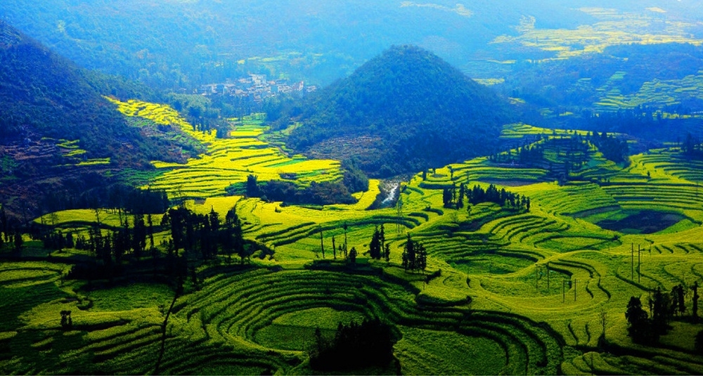 (2)螺丝田:梯田中的油菜花,从山上往下看,梯田就似一颗颗的螺丝,田间还兼种一些树木,与金鸡峰的壮观冲击不同,但也却别有独特之处。最佳拍摄观景时间为午后到日落期间。