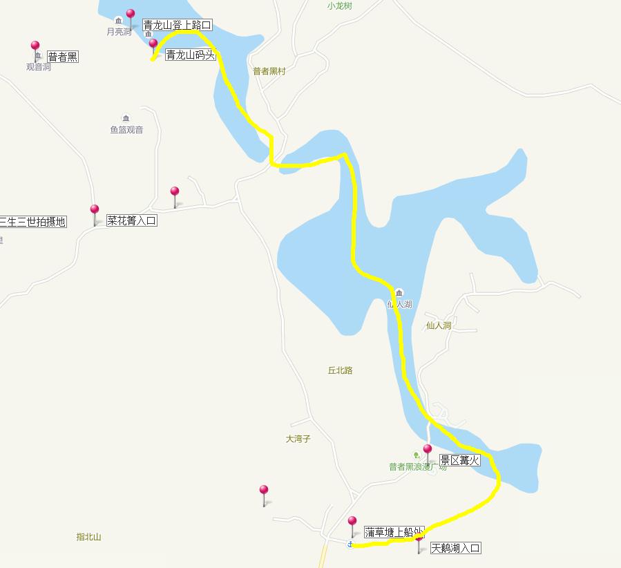 (1)普者黑打水仗:两个码头可坐为划船打水仗的起点,分别是青龙山码头与蒲草码头。如地图中的黄线部分为游船打水仗线路。